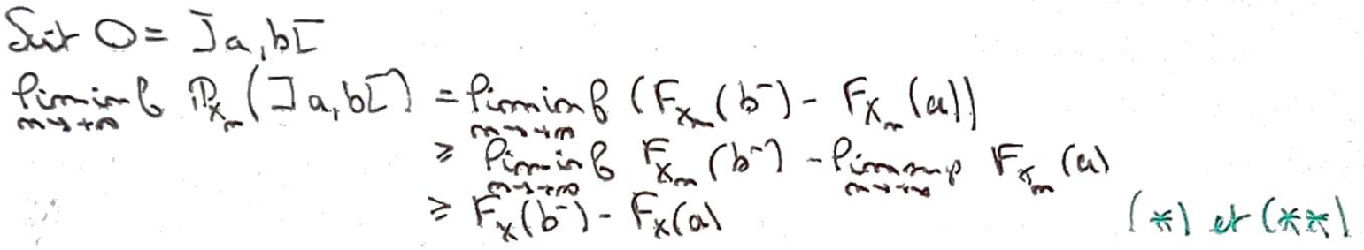 2i: Si \(O\) est un intervalle de \({\Bbb R}\), alors on peut ainsi minorer \(\varliminf{\Bbb P}_{X_n(]a,b[)}\).