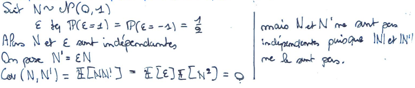 Recto: Donner un exemple de deux variables aléatoires dont la covariance est nulle, mais qui ne sont pas indépendantes.