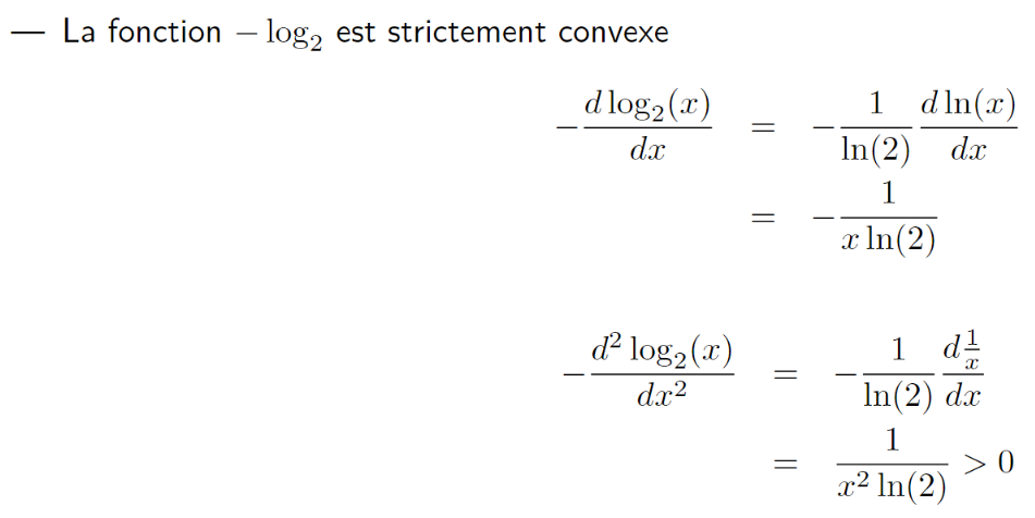 On dérive deux fois \(-\log_2\) pour montrer qu'elle est strictement convexe.