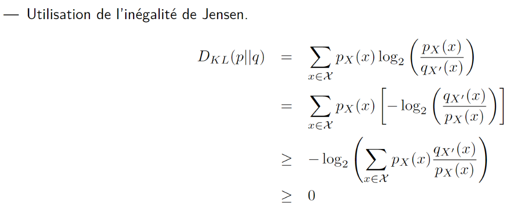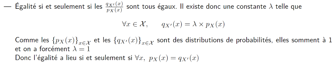 Le cas d'égalité se fait assez rapidement étant donné que \(p_X\) et \(q_{X^\prime}\) sont deux distributions de probabilité.
