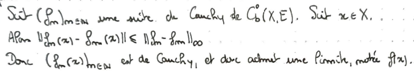 Montrer que si \((X,\mathcal U)\) est un espace topologique, et si \(E\) est un Banach, alors \(\mathcal C_b^0(X,E)\) est un Banach pour \(\lVert\cdot\rVert_\infty\).