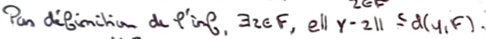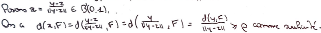 On prend \(y\in E\setminus F\) \(\to\) la distance de \(y\) à \(F\) est bien définie puisque \(F\) est fermé.