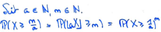 On sait que \(a\gt 0\) les lois possibles de \(\lfloor aX\rfloor\) sont \(\mathcal Geom(1-{\Bbb P}(X\geqslant\frac1a))\).