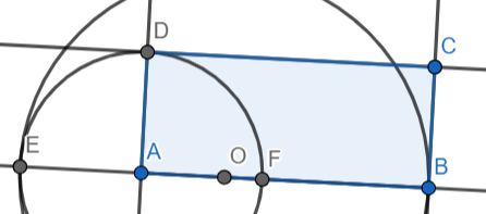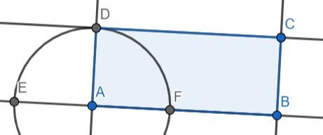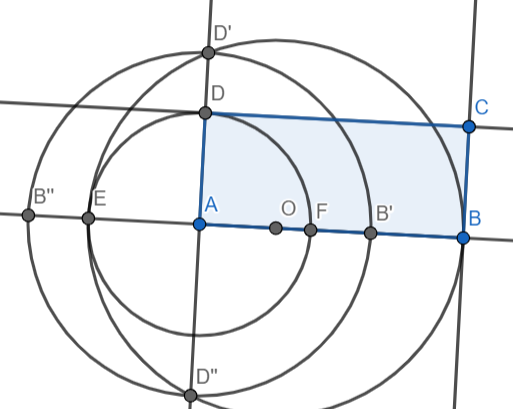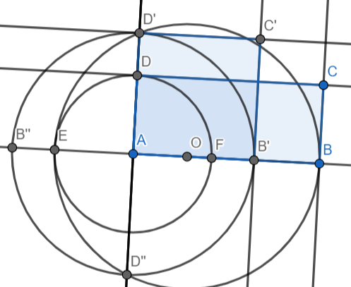 On veut \(\underbrace{AE\cdot AB}_{{\text{rectangle}}}=\underbrace{AD^{\prime2}}_{\text{carré}}\) (car on veut les aires égales)
