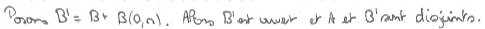 En ajoutant à \(B\) la boule centrée en \(0\) de rayon \(r\), on obtient un ensemble ouvert, toujours disjoint avec \(A\).