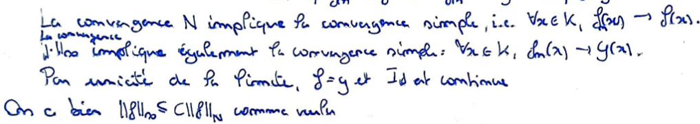 - pour toute suite de \((f_n)_{n\in\Bbb N}\) qui converge dans \((\mathcal C^0(K,{\Bbb R}),N)\) vers une limite \(f\), on a \((f_n)_{n\in\Bbb N}\) qui converge simplement vers \(f\) sur \(K\).