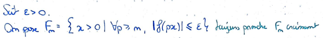 On pose \(F_n\) l'ensemble des points \(x\) pour lesquels pour tout entier \(p\geqslant n\), \(\lvert f(px)\rvert\leqslant\varepsilon\).