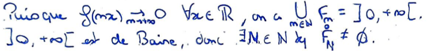 L'union des \(F_n\) est \(]0,+\infty[\), qui est de Baire (métrique complet), donc d'après le Théorème de Baire, il existe un \(F_n\) d'intérieur non vide.