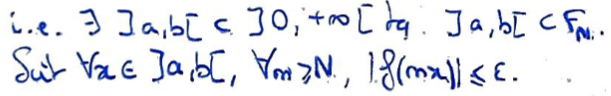 Donc il existe un intervalle ouvert et \(N\) pour lesquels \(\forall n\geqslant N,\lvert f(nx)\rvert\leqslant\varepsilon\).