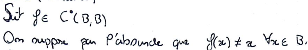 On prend \(f:B^\prime(0,1)\to B^\prime(0,1)\) continue, et on suppose par l'absurde quelle ne possède pas de point fixe.