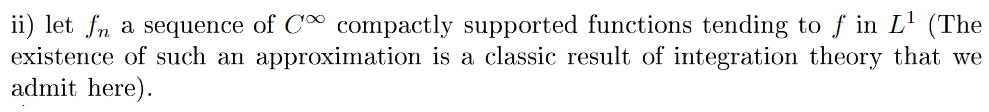On approche \(f\in L^1\) par une suite de fonctions \(\mathcal C^\infty\) pour \(\lVert\cdot\rVert_1\).