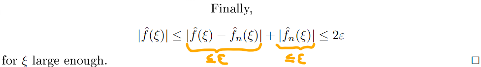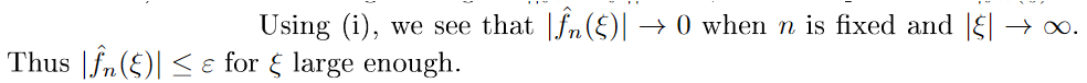 Le point \((i)\) nous dit que \(\lvert\hat f_n(\xi)\rvert\leqslant\varepsilon\) pour \(\xi\) assez grand.