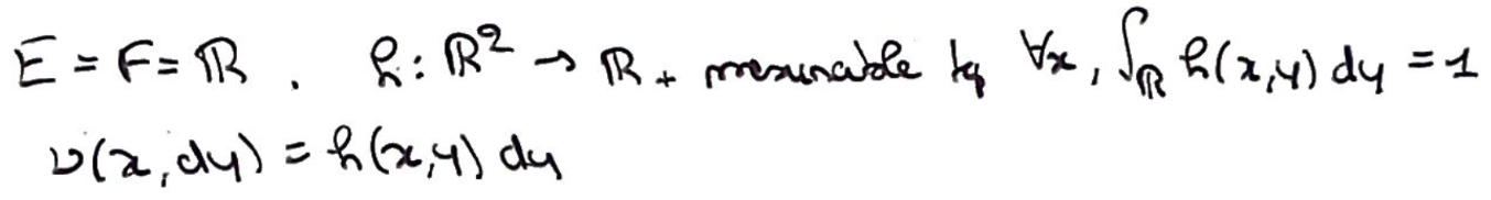 - si \(h\) est mesurable et positive/bornée, alors \(x\in F\mapsto\int_{[0,+\infty]}\nu(x,dy)h(y)\) est mesurable et positive/bornée