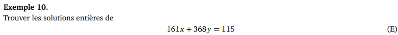 - Si \(\operatorname{pgcd}(a,b)|c\), alors il existe même une infinité de solutions entières et elles sont exactement les \((x,y)=(x_0+\alpha k,y_0+\beta k)\) avec \(x_0,y_0,\alpha,\beta\in{\Bbb Z}\) fixés et \(k\) parcourant \({\Bbb Z}\)